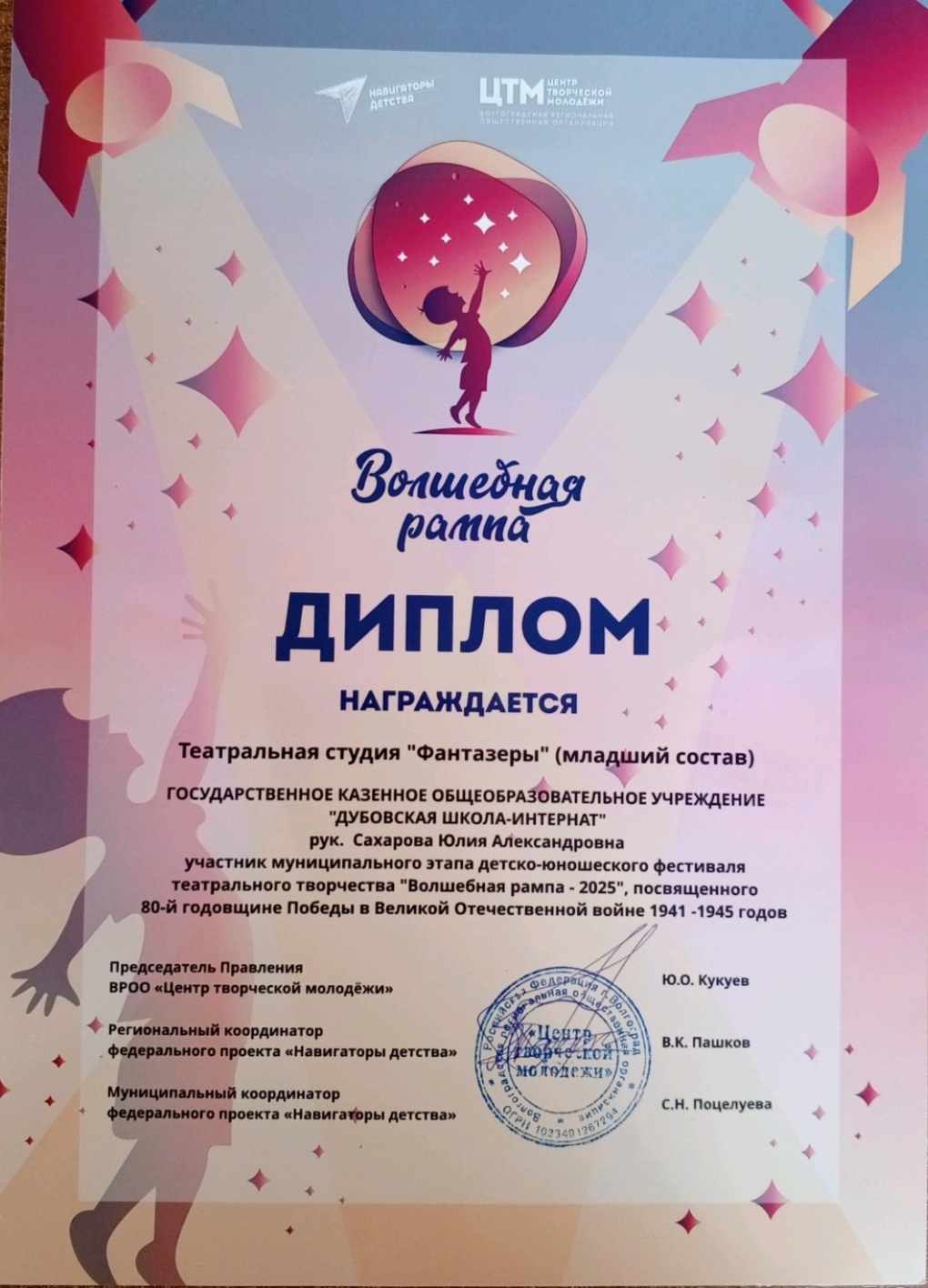 Участники театральной студии "Фантазёры" получили диплом за участие в муниципальном этапе детско - юношеского фестиваля театрального творчества "Волшебная рампа - 2025", посвященного 80-й годовщине Победы в Великой Отечественной войне. Мы гордимся подвигом наших героев и бережно храним память о тех тяжёлых днях.