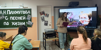 Также учащиеся посмотрели клипы на известные советские песни А.Н. Пахмутовой «Птица счастья», «Орлята учатся летать», «Трус не играет в хоккей» и др.