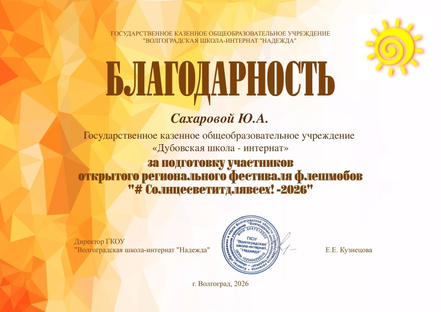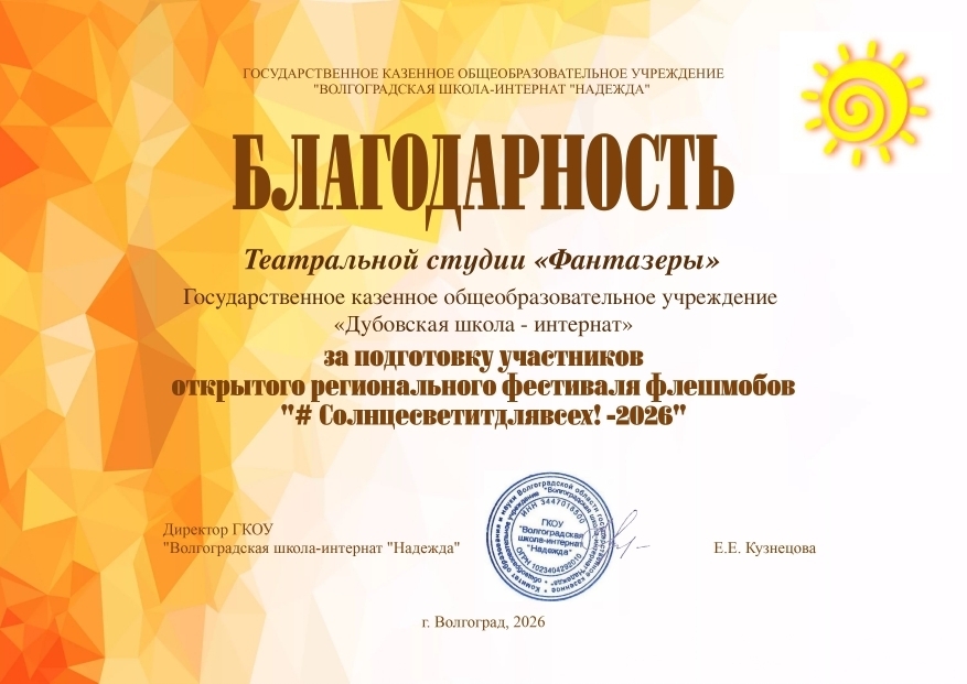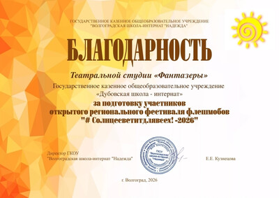 Участники театральной студии "Фантазеры" под руководством Сахаровой Ю.А. приняли участие в открытом региональном фестивале флешмобов "#Солнцесветитдлявсех! – 2026"! Это важный фестиваль, посвященный Международному Дню детей с синдромом Дауна. Ребята нашей школы создали добрый душевный мультфильм. Сказочный сюжет о лесных жителях объединяет и сплачивает героев. Фестиваль показал, как много мы можем достичь вместе, используя современные технологии и неиссякаемую энергию наших ребят. Участники коллектива и педагог получили благодарность и теплые слова признательности за то, что активно привлекли своих воспитанников и помогли создать уникальную атмосферу радости, творчества и единения. | |