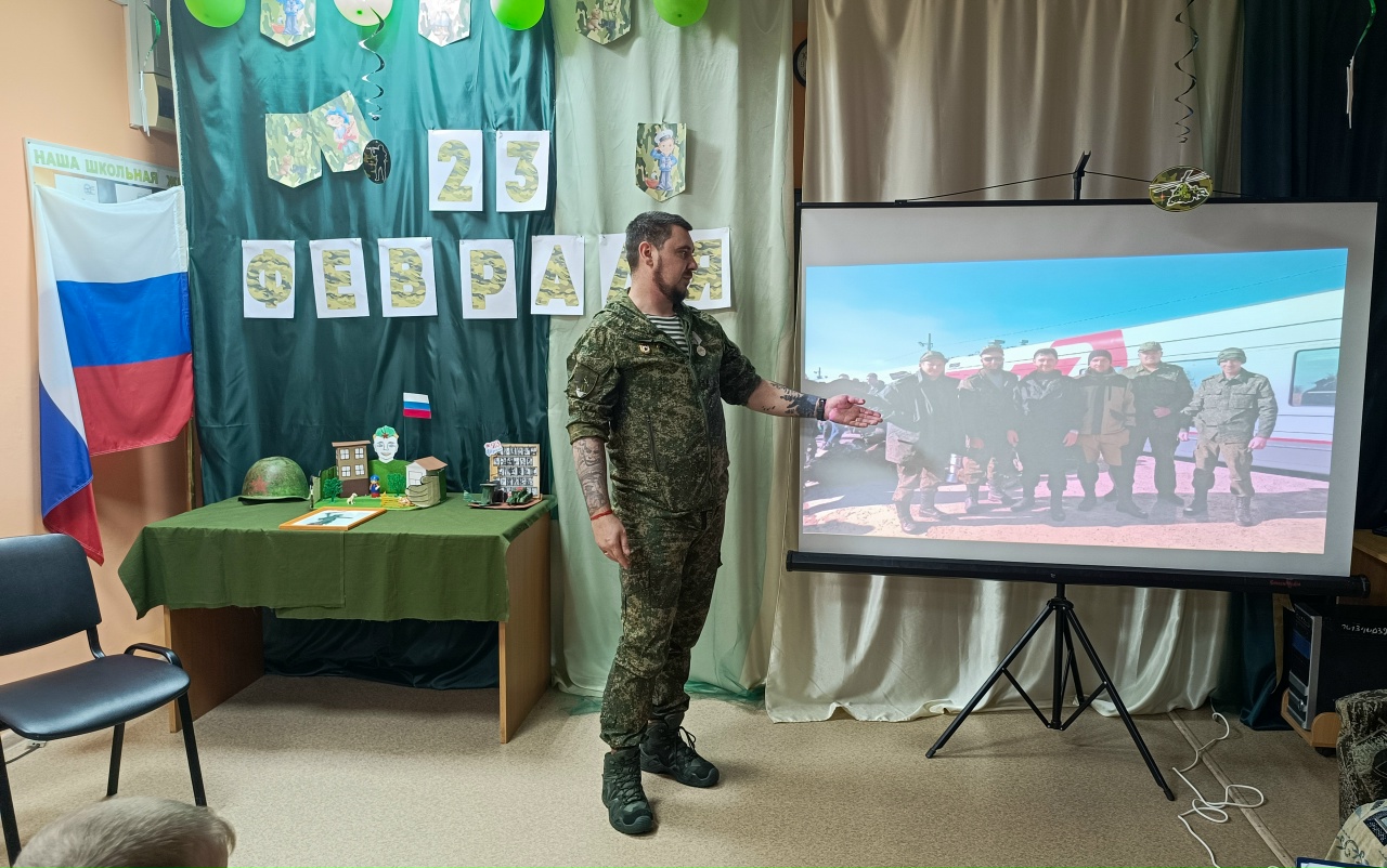 19 февраля в нашей школе состоялась встреча с Овчаровым А.В., участником боевых действий в зоне специальной военной операции. Сейчас он находится в отпуске и пришел поделиться с ребятами своими впечатлениями о службе.
